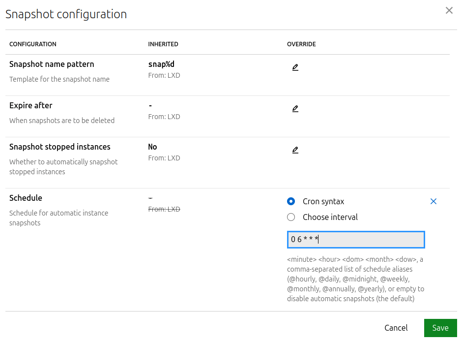 lxc config set <instance_name> snapshots.schedule "0 6 * * *"