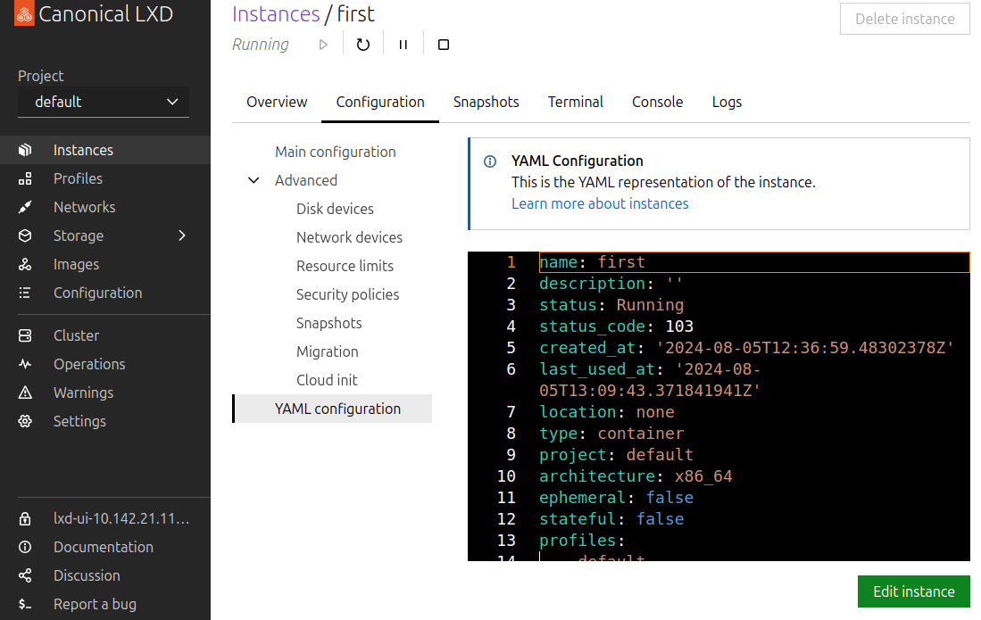 While the installation and initialization steps must be performed via the command line interface, a graphical interface (the LXD UI) is available for use after these setup steps. The LXD UI is accessed through your web browser.
